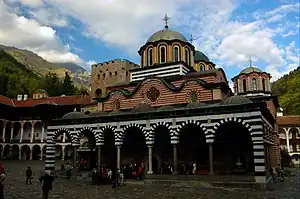 - The monastery has a spectacular architecture which is well combined with the picturesque nature of the Rila Mountain. Inside the complex, the main church stands in the center of the inner ring. The entire church is decorated with amazing wood-carving, and it's famous for the gold-plated iconostasis. Outside the Rila Monastery, you can find a variety of little pubs and restaurants, where one can experience the fine Bulgarian cuisine. There are a lot of gift shops for the tourists with reasonable prices.