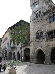 - The Muratet house is an interesting example of medieval civil construction. Partly built in the early 13th century and enlarged in the 15th, the original building was probably a farmhouse. The façade, despite changes in the 19th century, retains its ashlar dressing and all the elements needed to understand its original order: three levels bordered by projecting moulded string courses (the first string based on a series of carved corbels); a series of arches on the lowest level (ground floor shops); two rows of four double windows in a pointed arch, connected by transom strings. At the end of the 15th century, the pointed arcades on the ground floor were replaced by segmental arches and a door lintel decorated with an ogee arch. Most double casement windows were transformed into quads. The elevation facing the courtyard was rebuilt with rubble at the end of the 15th century. The first floor consisted of two rooms separated by a wood-framed cob wall, supported by a central masonry pillar. Important remnants of a mural depicting griffins on interlaced medallions and an upper frieze of heraldic knights, dating to the first half of the 13th century are preserved on this wall. A spiral staircase with load-bearing core is built into an oval shell half protruding through the side façade, starting from the street. With its ogee-arched front door and various openings, its construction can be dated to the late 14th or early 15th century. It is considered to be one of the first examples of the spiral staircases which gradually replaced older square staircases of wood or stone in Saint-Antonin.