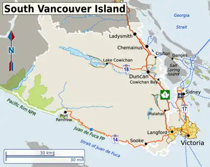 The main highways into South Vancouver Island are Highways 1 and 17.