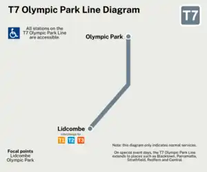 Olympic Park is accessible through its own π Olympic Park Station. Most of the time, you'll need to travel to Lidcombe station and transfer to the T7 Olympic Park Line (Olympic Park sprint) at Platform 0. Trains leave Lidcombe Station every 10 minutes, but frequencies may change during trackwork weekends. During major events, direct trains to Olympic Park also run from Central, Redfern, Strathfield and Parramatta stations, and sometimes also from other locations. Olympic Park station is wheelchair accessible.
