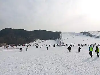 - 🌍 Panshan Ski Area (盘山滑雪场), Intersection of Panshan Avenue and Yanshan West Street (盘山大道与燕山西大街交汇处) (take a train or long-distance bus to Jizhou District, then take Jizhou Bus 58 or Tourist Bus 11), ☏ +86 22 29767777, +86 22 82718888. A dilapidated ski park for beginners to experience snow sports for the first or second time.There are several bunny hills strewn with the bodies of fallen beginners slow to pick themselves up, posing serious collision hazards. Entrance and ski equipment rental costs only ¥5. If you need clothing, gloves goggles, helmet, or an instructor, rental costs will be charged and deducted from the ¥200 entrance deposit. Snowboard rental costs ¥50. During the summer months, the ski field offers other activities such as grass sledding, horse riding and go-kart racing. Located in the outer lying north of Tianjin and about 2 hours from Beijing. ¥5 minimum. (updated Jan 2019)