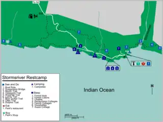 - Storms River Mouth Rest Camp, ☏ +27 44 281-1607, reservations@sanparks.org. The bigger of the two with more facilities.