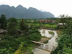 - 🌍 Padeng Cave and Ring Cave (cross a footbridge over the river, follow the signs and white flags (garbage bags) on sticks through the field). Across the river a 1.5-km path marked by white flags cuts through the fields towards the limestone mountains. The smallest hill has very rickety ladders, and somewhat dangerous, to aid in climbing to the top. Halfway up the mountain is a cave. Another 1 km along the path past the mountain goes through a small forest and arrives at a cave. A few sleepy Laotians guard the cave's entrance and will only charge 10,000 kip. However, on exit, they'll ask for 50,000 kip for the guide and 50,000 kip per lamp. A couple of men carving reeds with machetes are nearby so negotiation may be difficult. 10,000 kip for the hill, 10,000 kip for the cave, 50,000 kip for a guide and 50,000 kip to rent a torch.
