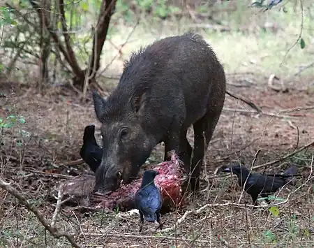 Of 215 bird species of the park, six are endemic to Sri Lanka. They are Sri Lanka Grey Hornbill, Sri Lanka Junglefowl, Sri Lanka Wood-pigeon, Crimson-fronted Barbet, Black-capped Bulbul, and Brown-capped Babbler. The number of waterbirds inhabiting wetlands of Yala is 90 and half of them are migrants. Waterfowls (Lesser Whistling Duck, Garganey), Cormorants (Little Cormorant, Indian Cormorant), large waterbirds (Grey Heron, Black-headed Ibis, Eurasian Spoonbill, Asian Openbill, Painted Stork), medium-sized waders Tringa spp., and small waders Charadrius spp. are among the common waterbirds. Black-necked Stork and Lesser Adjutant are the rare birds that can be seen in the park. The migrant Great White Pelican and resident Spot-billed Pelican are also have been recorded. Other waterbirds attracted to the Yala lagoons include Lesser Flamingo, and Pelicans, and rare species such as Purple Heron, Night herons, Egrets, Purple Swamphen, and Oriental Darter. Thousands of waterfowls migrate to the lagoons of Yala during the northeast monsoon. They are Northern Pintail, White-winged Tern, Eurasian Curlew, Whimbrel, Godwits, and Ruddy Turnstone. The visiting species mingled with residing Lesser Whistling Duck, Yellow-wattled Lapwing, Red-wattled Lapwing, and Great Stone-curlew. Rock Pigeon, Barred Buttonquail, Indian Peafowl, Black Stork, Black-winged Stilt, and Greater Flamingo are among the other bird species. Crested Serpent-eagle and White-bellied Sea Eagle are the raptors of the park. The forest birds are Orange-breasted Green Pigeon, Hornbills, Old World flycatchers, Asian Paradise-flycatcher, Asian barbets, and Orioles.