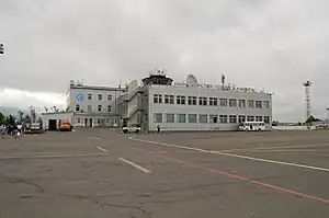 - 🌍 Yuzhno-Sakhalinsk Airport Khomutovo (UUS ) (situated 8 km south of downtown and can be accessed by public buses 3 and 63 or by taxi.), ☏ +7 4242 788390, +7 4242 788055. Flights from major Russian cities and from several East Asian cities. As of 2017, Aurora (a subsidiary of the national carrier Aeroflot) has by far the largest presence on this airport. Despite its moderate size, the airport has a luggage room, a cafe and a food store. The airport closes during the night however police can let you stay overnight inside the terminal building if you have boarding card. The airport is subject to long closures under bad weather conditions.