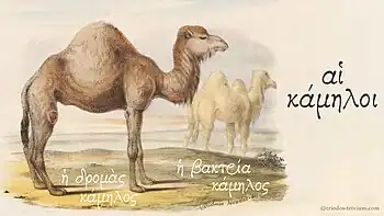 | Accusative | τὸν, τὴν κᾰ́μηλον tòn, tḕn kámēlon |