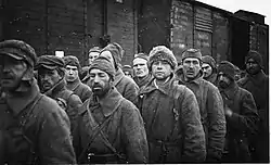 - Synonyms: полоне́ний m (polonényj), (folk poetic) бра́нець m (bránecʹ)