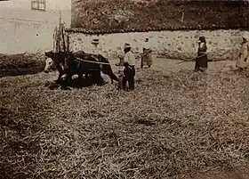 - (agriculture) threshing-floor, cleared plot of land in farms on which stacks of grain are piled, accompanied by threshing and processing of grain
