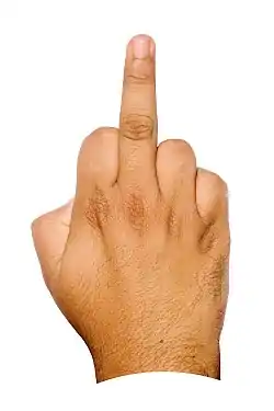 сре́дний па́лец • (srédnij pálec) m inan (genitive сре́днего па́льца, nominative plural сре́дние па́льцы, genitive plural сре́дних па́льцев)