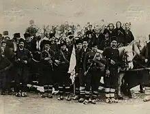 photo of old Bulgarian wedding ceremony displaying (in the middle) a сватбен стяг