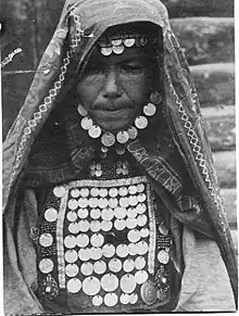 4. (traditional costume) metal pieces of decoration (originally silver coins) sewn on women's traditional clothes or interwoven into hair braids