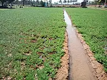 - irrigation ditch, a long, shallow indentation used to channel water in a field or garden