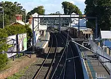 - railway station, terminal (place at the end or on a railway line where trains regularly stop so that passengers can embark or disembark)