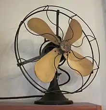 - fan (electrical apparatus with rotating blades that creates a current of air for cooling or ventilation)