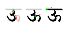 • This letter is used when a syllable begins with the vowel sound /uː/. When the vowel sound follows a consonant, the corresponding matra (vowel diacritic) is used instead: . For example, the consonant /k/ is written , so the syllable /kuː/ is written कू.