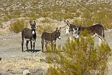 - donkey, a domesticated equine animal, commonly used as beasts of burden.