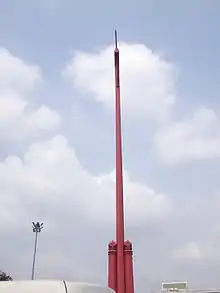 - (architecture) pair of poles fixed into the ground for the purpose of bracing another pole.