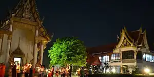 people waking clockwise around the hall of Wat Khung Taphao