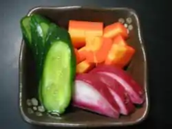 Compound of お (o-, honorific prefix) + 新香 (shinkō, shinko, literally “new fragrance”, as these were traditionally only pickled for a few days).[1][2] Usage appears to be shifting now from meaning specifically lightly pickled vegetables, to meaning pickled vegetables in general.