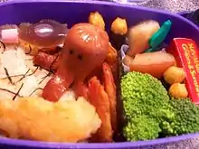 1. octopus sausage (wiener sausage with cuts in the base that cause the sausage to curl when cooked, resembling an octopus' limbs)