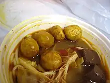 Some curry fishballs served with noodles and other ingredients