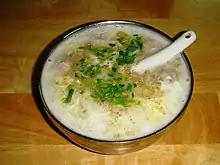 - (Kinmen Hokkien, specifically) Cantonese-style congee (a popular breakfast item in Kinmen)