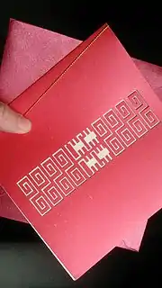 - (figurative, informal, humorous) red-coloured wedding invitation card (which implies a loss of money for the receiver in the near future, from having to give a red packet upon attendance)