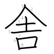 | For pronunciation and definitions of 舎 – see 舍 (“lodging place for guests; inn; hotel; house; residence; reside; etc.”). (This character is a variant form of 舍). |