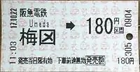 - A variant of 田, as in 梅田 (Umeda, place name in Osaka), used by Hankyu Railway. This way of writing was for easy identification of tickets to Umeda before ticket vending machines were introduced because it is the busiest station in the whole Hankyu system.