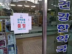 Korean pharmacy during COVID-19 pandemic stating masks were sold out.