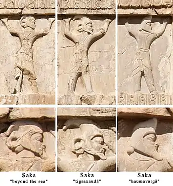 Reliefs depicting the soldiers of the Achaemenid army, Xerxes I tomb, circa 480 BCE. The Achaemenids referred to all nomads to their north as Saka, and divided them into three categories: The SakΔ tyai paradraya ("beyond the sea"), the SakΔ tigraxaudΔ ("with pointed caps"), and the SakΔ haumavargΔ ("who lay Haoma around").[1]