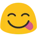 A face with smiling eyes and a broad, closed smile with its tongue sticking out of one corner, as if licking its lips in appetite or contentment.