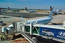 Fluggastbrücke f (genitive Fluggastbrücke, plural Fluggastbrücken)