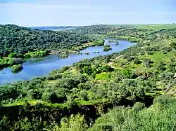 From Old Galician-Portuguese Aguadiana, possibly from Old Spanish Aguadiana, from Arabic وَادِي (wādī, “river, valley”) + Latin Anās (ancient name of the river). Displaced the doublet Odiana.