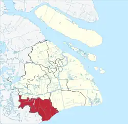 The atonal Hanyu Pinyin of the Mandarin pronunciation of Chinese 金山 (Jīnshān, literally “Gold Mountain”), named for Dajinshan Island to its south, the highest point of natural elevation in Shanghai Municipality.