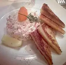 Compound of toast (“toast”) + Skagen. Coined by Swedish chef Tore Wretman in the 1950s.