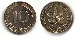 1. (money) a German ten-pfennig coin, a ten-pfennig piece