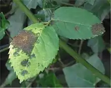 - (phytopathology) A fungal disease among plants, particularly roses, that results in black spots on the leaves.