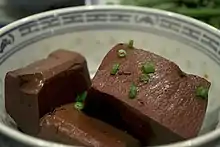 - A food product made of coagulated animal blood, used in various Asian cuisines.