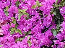 - Any of several South American flowering shrubs or lianas, of the genus Bougainvillea, having three showy, colorful bracts attached below each group of three inconspicuous flowers.