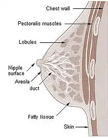 - (anatomy) Either of the two organs on the front of a female human's chest, which contain the mammary glands; also the analogous organs in males.