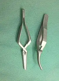 - (surgery) A surgical instrument with serrated jaws and a spring-loaded handle used to grip blood vessels or similar organs.