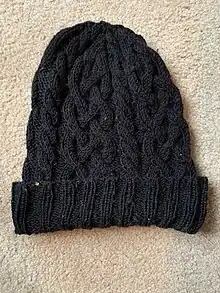 A coiled pattern, achievable by knitting stitches out of order; loops are put on the cable needle, the subsequent loops are knitted, and then the loops from the cable needle are returned to the main needles and knitted.