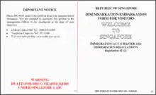 Drug trafficking is a capital crime in Singapore, as shown in this entry card.