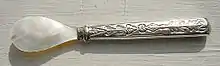 Mother-of-pearl caviar spoon, 14 cm (5+½ in), with engraved sterling silver handle