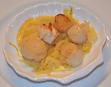 - A scallop shell or a dish shaped like one, especially when used to serve the aforementioned food.