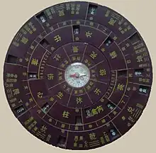 A luopan, a magnetic compass used by practitioners of feng shui (sense 2) to determine the precise direction of a structure or other item.