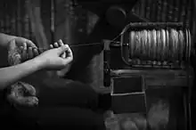- lady Mary was spinning a large spindleful of flax: she moistened the fist two finger of her left hand on her lips and, pulling down, she was making a thread of that handful of stricks, while with her right hand she was winding it in the spindle, which danced slowly