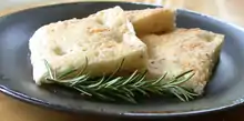 Focaccia bread with rosemary garnish.