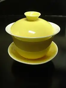 - A Chinese lidded cup or bowl, used to steep tea, sometimes including a saucer, developed during the Ming dynasty as an improvement upon the (lidless) chawan.